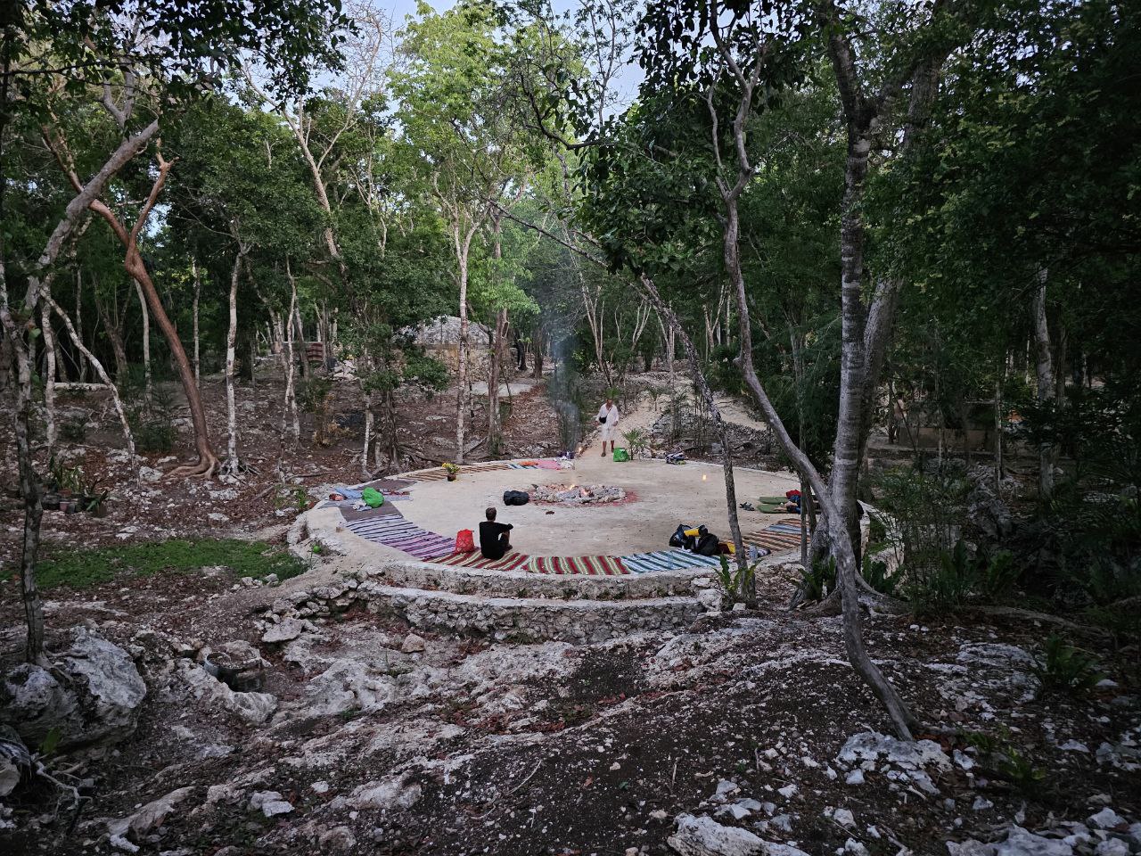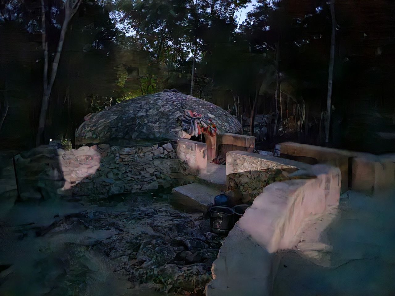 Мы доехали до парка и долго ехали по неровной дороге к месту проведения церемонии. Мои ожидания подтвердились: я уже был в этом месте, это так называемая Área Científica. Индейцы построили это место как центр для возрождения индейской культуры, там есть и школа, и пирамида, и площадки для проведения церемонии, и темаскаль с сенотом неподалёку для окунания, и даже туалет с подведённой водой. Даже интернет есть! Год назад индейский шаман дон Хуан проводил в этом месте приватную церемонию с пейотом для нас с Машей; до сих пор помню, как в разгаре трипа он предложил нам покурить конопли, в итоге я погрузился в глубочайшую медитацию, а Маша словила бледного (хотя, учитывая контекст, скорее, бледнолицего). На фотографии, кстати, темаскаль, в котором Хуан нас с Машей парил перед приёмом пейота: