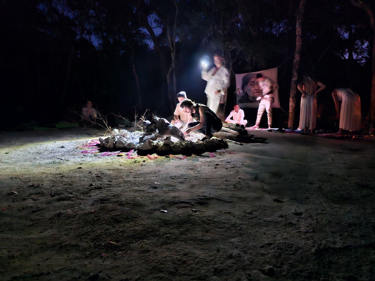 Никита объявил 20-минутное окно без исполнения музыки для ритуала со священным огнём. Кто угодно, кто чувствовал внутреннюю потребность, мог подойти к огню, высказать благодарность кому угодно и чему угодно, или же мысленно бросить в огонь что-то, от чего хочет избавиться. Первым встал он сам, на колени перед костром, вид совершенно отлетевший, долго благодарил все силы и самого Бернардино. Затем подошла Наташа, после неё ещё кто-то, следом вышел Бернардино и снова начал свои камлания и мантры на масатекском, ходил по кругу, а Никита ходил за ним. Я сел и стал медитировать, смотря на костёр, настраиваясь на мантру Бернардино; через какое-то время вообще всё перестало существовать, даже сам костёр превратился во что-то неразличимое, а весь окружающий мир слился в какую-то картинку по мотивам без деления на объекты, времени не было, личности моей тоже не было. Вокруг ходила Ника с чашей, из которой дымило мексиканское благовоние копаль (священная смола бобового дерева), она помахала чашей перед моим носом, благодаря чему я немного пришёл в себя. Затем снова погрузился в глубокую медитацию, но немного другого характера: теперь я видел костёр, на котором концентрировался, видел самого Бернардино, но не различал остальных участников, и мне показалось, что мы все сидим на берегу моря, я попробовал удержать это видение и у меня получилось. Следом мне показалось, что мы находимся во дворе какого-то отеля для чёрных в южных Штатах времён сегрегации, и эту картинку мне тоже удалось удержать. За этим видением были тайга, пустыня, заброшенный завод, все эти картины мне удавалось держать довольно долго, неизменными были только костёр и сам Бернардино. Вместо заявленных 20 минут получилось полтора часа непрерывного камлания, а у меня, получается, полтора часа непрерывной медитации. Бернардино закончил, объявили церемонию какао; Ника разливала какао в одноразовые стаканчики, я встал, ноги меня не слушались совершенно, подошёл к ней и взял два стакана, для себя и для Маши.