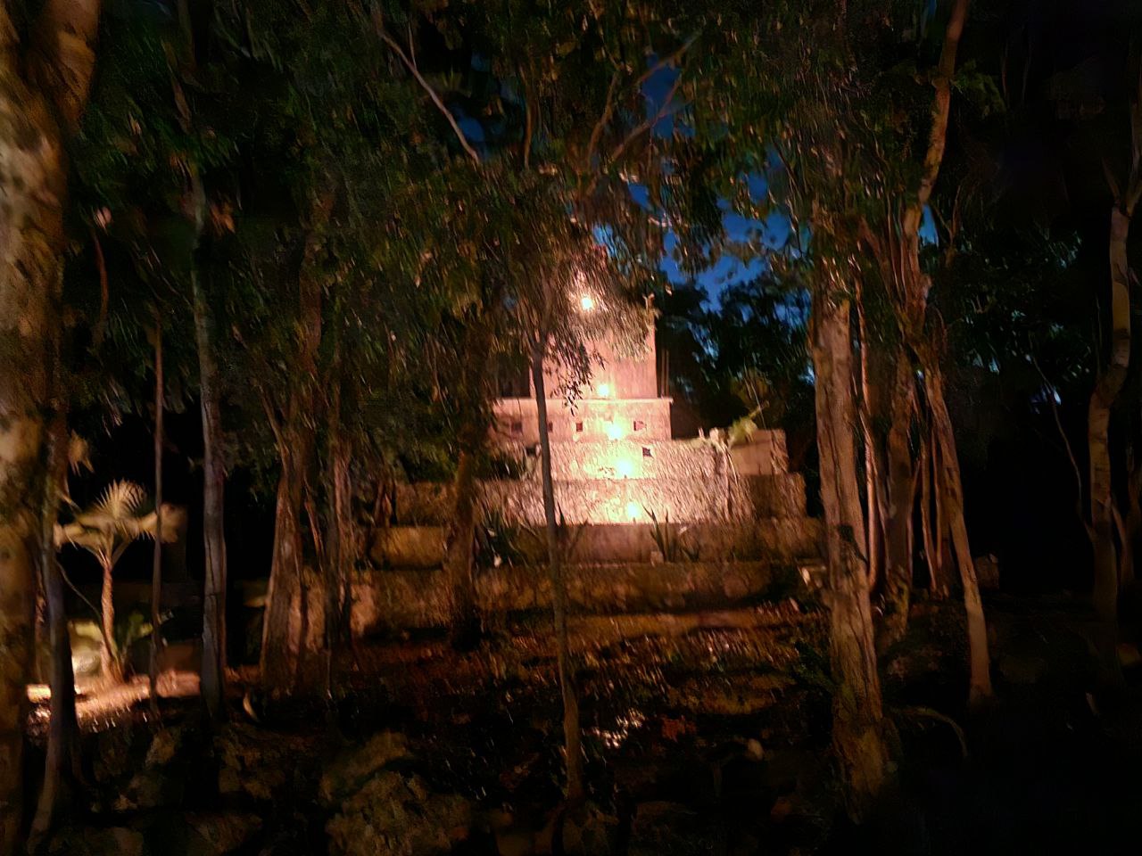 Тем временем на улице светало; участники из тех, кто приехал самостоятельно, начали собираться. Мы пообщались с Димой про мексиканскую мафию и методы её работы, Дима сказал, что мексиканцев в мафиозных схемах очень сложно мотивировать, деньги интересуют далеко не всех из них, а смерти и насилия они не боятся вовсе. Попрощались с Никитой и Наташей, в итоге остались только те, для кого Ника организовывала трансфер на двух машинах. Наши машины должны были приехать в 7:30 утра, времени ещё полно, Маша устала и лежит на своём месте, а я решил пошароёбиться по окрестностям, например, отошёл за сенот и сфотографировал пирамиду:
