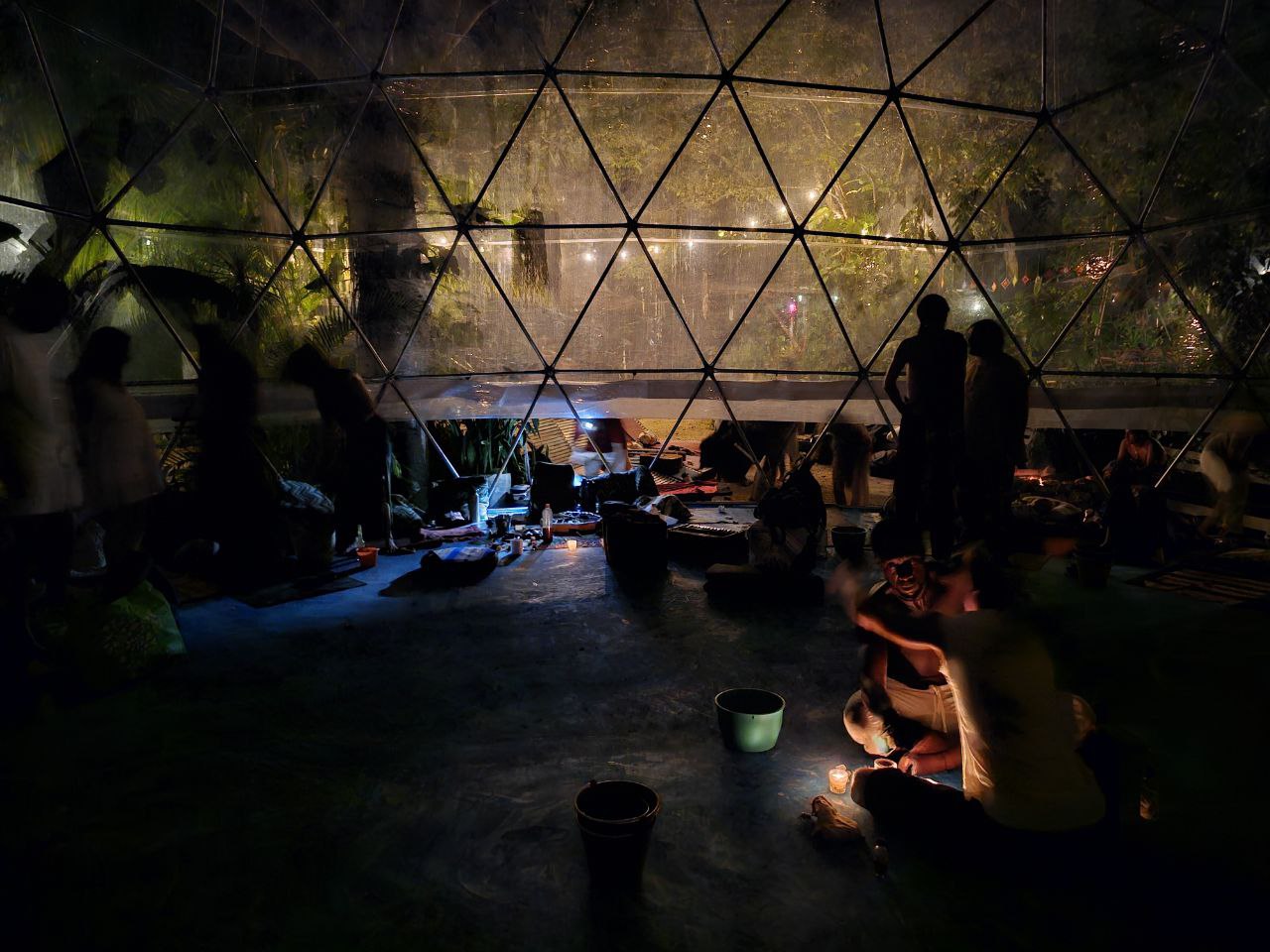Я всё думал, как мы будем ходить в туалет во время церемонии, ведь свет везде гасят, а купол круглый в основании, никакого ориентира, где и что находится. По факту же и в ночной темноте внутри купола было довольно светло, было видно костёр снаружи, да и небо не было полностью тёмным, рядом всё же федеральная трасса, крупный универмаг и парк развлечений. Всё видно, короче.