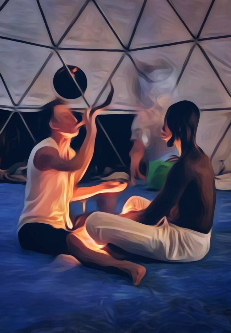 Совсем рядом с куполом развели костёр, там же было много скамеек и лежанок, там сидели Иван с Памелой и фасилитаторы, и мы пошли туда здороваться со всеми. Я поприветствовал Наташу, подошёл к Никите, протянул руку и говорю, типа, привет, Никитосик, он же ответил мне как-то без энтузиазма, и вид у него какой-то опиздошенный. Ну, хули, процессы какие-то у человека проходят. Иван объявил о церемонии рапэ прямо там у костра, Момо и Алекс расстелили коврики на земле, я сразу к Момо, Маша за мной, Ирвинг за Машей. Хорошо!